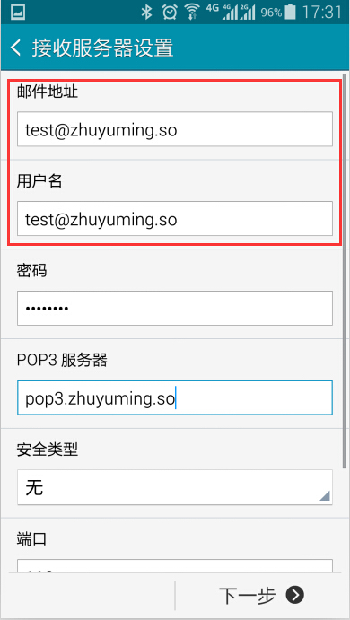下面以填 POP3 協(xié)議設(shè)置為例,填寫接收服務(wù)器地址及用戶名。
