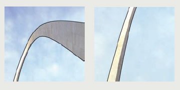 因?yàn)檫@種一線式設(shè)計(jì)對(duì)所有的細(xì)節(jié)(如顏色及圖案)都視而不見(jiàn),只集中表現(xiàn)其輪廓的外觀特征,所以在上面這個(gè)拱門的建筑上,我們需要采用其上圖左拱形的部分,而不是上圖右的部分。