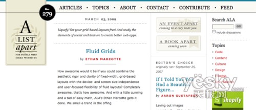 A List Apart中使用的可視格欄非常有特色。里面的欄目設(shè)計(jì)良好,把所有包含內(nèi)容都變得易于閱讀。研究表明過寬的欄目會(huì)造成嚴(yán)重的閱讀困難。在跟隨那么寬的欄目中的文字時(shí),你的眼睛會(huì)變得很累。