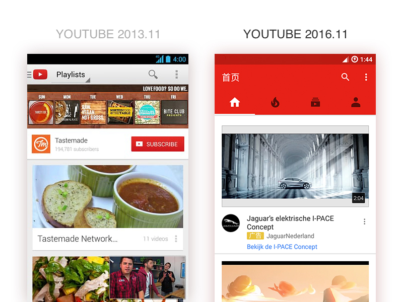 欣慰的是,越來越多的應用和網站正在嘗試用更有效的方法解決這個問題。這里我整理出了市面上能見到的所有方法進行比較。有趣的是,Youtube 作為側抽屜的開山鼻祖,它也不用了。