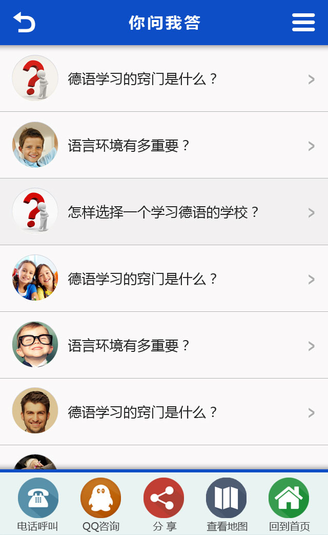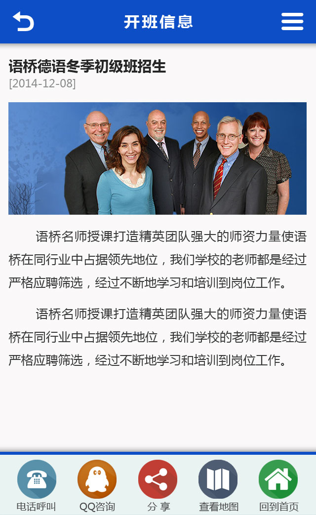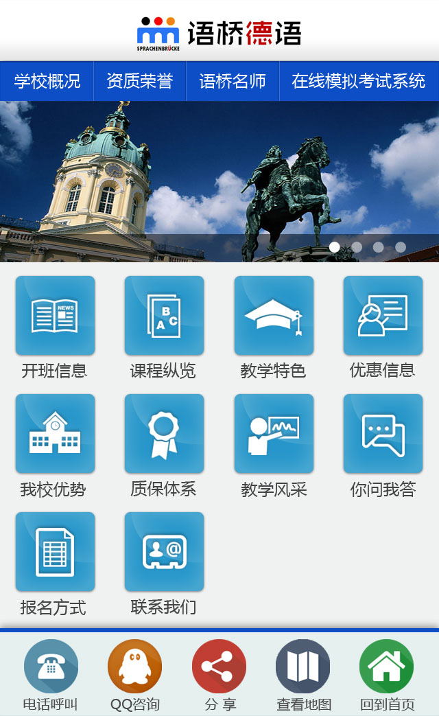 語橋德語手機網(wǎng)站欄目:開班信息 課程縱覽 教學(xué)特色 優(yōu)惠信息 我校優(yōu)勢 質(zhì)保體系 教學(xué)風(fēng)采 你問我答 報名方式 聯(lián)系我們