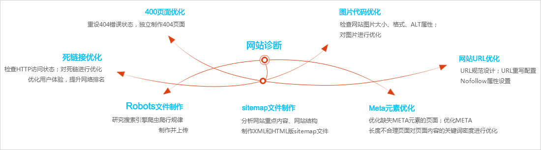 仟億網(wǎng)站優(yōu)化策略的實施包括死鏈接優(yōu)化、404頁面優(yōu)化、Robots文件制作,圖片代碼優(yōu)化、網(wǎng)站URL 優(yōu)化、Sitemap文件制作、Meta元素優(yōu)化七大網(wǎng)站優(yōu)化要素,傳悅從這七個 主要方面出發(fā),進行多維度、網(wǎng)站優(yōu)化,七大要素互相關(guān)聯(lián),聯(lián)手往復,流轉(zhuǎn)不息。