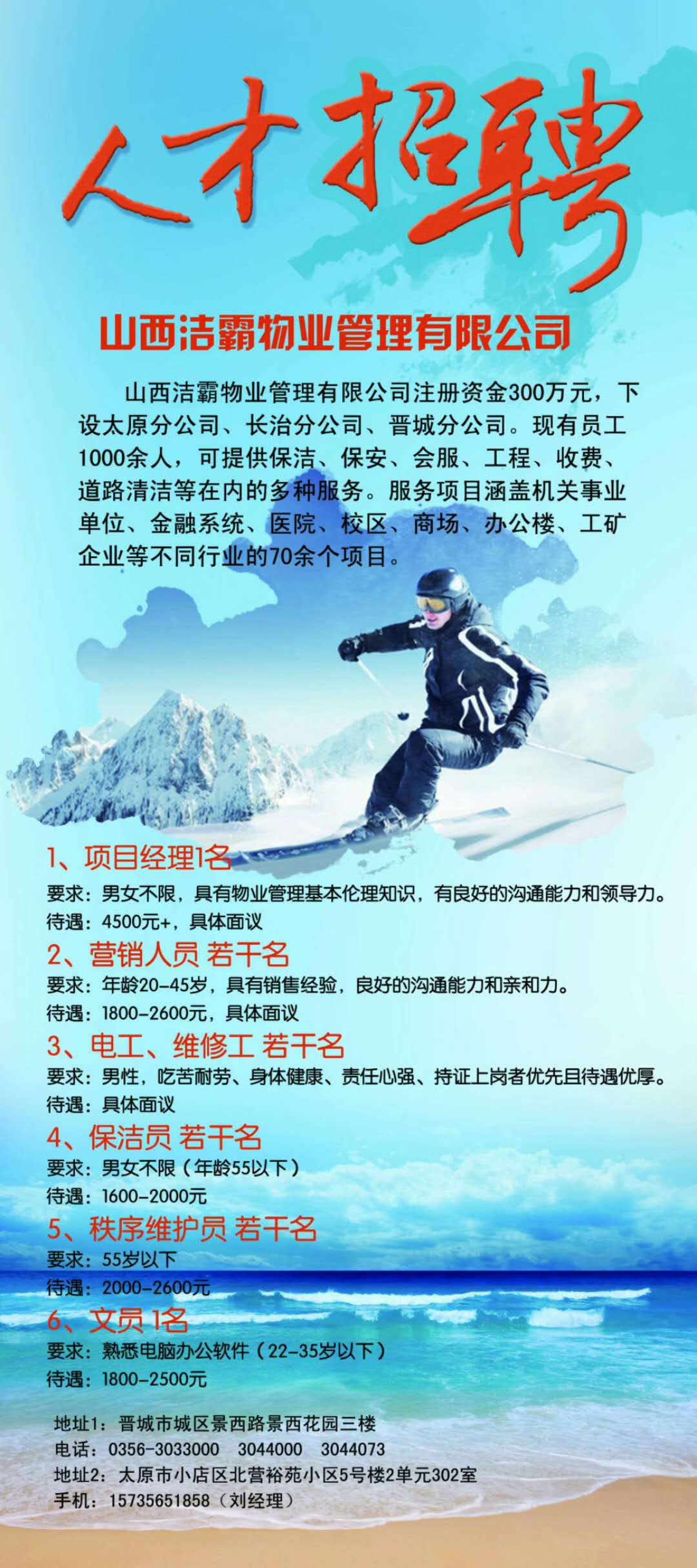 潔霸公司太原分公司現(xiàn)在正是招賢納才時候,希望各位有理想、有抱負的年輕人可以加入我們,共同為潔霸公司更加美好的明天而努力!