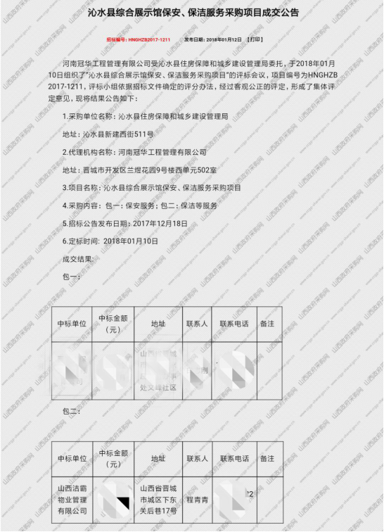 (2)沁水縣綜合展示館保安、保潔服務(wù)采購項目成交公告