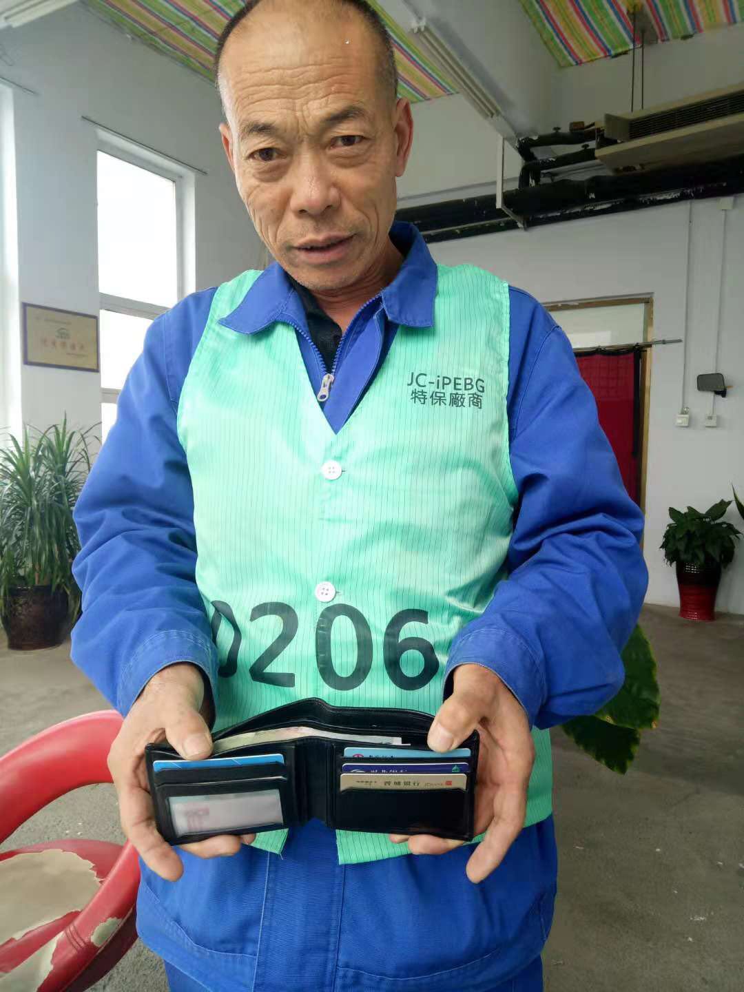 2018年10月16日,我公司員工賈聯(lián)化在富士康清潔時發(fā)現(xiàn)一個男士錢包,里面有加油卡、銀行卡以及一些現(xiàn)金,賈師傅連忙通知了部門主管,請她幫忙聯(lián)系失主。
