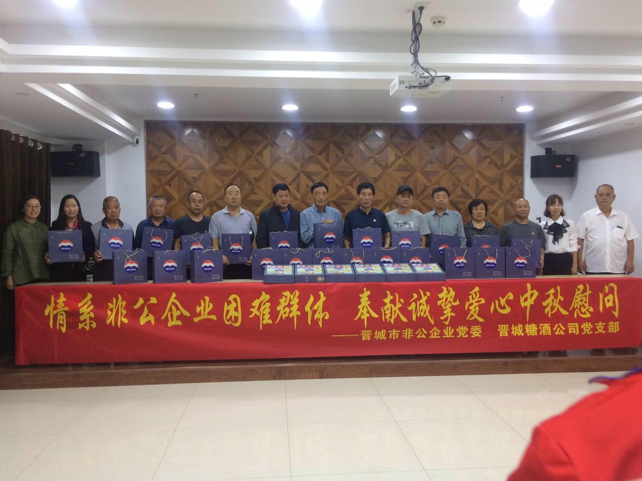 最后,在潔霸公司黨群活動(dòng)室,市非公企業(yè)黨委李凱霞科長(zhǎng)和晉城糖酒公司黨支部、貴州茅臺(tái)山西省晉城糖酒專(zhuān)賣(mài)店的工作人員為困難黨員發(fā)放了月餅,并和大家合影留念。