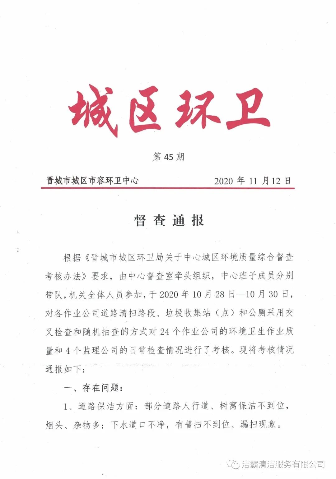 2020年10月28日—10月30日,晉城市城區(qū)市容環(huán)衛(wèi)中心由中心督查室牽頭組織,中心班子成員分別帶隊(duì),機(jī)關(guān)全體人員參加,對各作業(yè)公司道路清掃路段、垃圾收集站(點(diǎn))和公廁采用交叉檢查和隨機(jī)抽查的方式對24個作業(yè)公司的環(huán)境衛(wèi)生作業(yè)質(zhì)量和4個監(jiān)理公司的日常檢查情況進(jìn)行了考核。晉城市潔霸清潔服務(wù)股份有限公司所屬的環(huán)衛(wèi)四公司分?jǐn)?shù)最高,名列第一。
