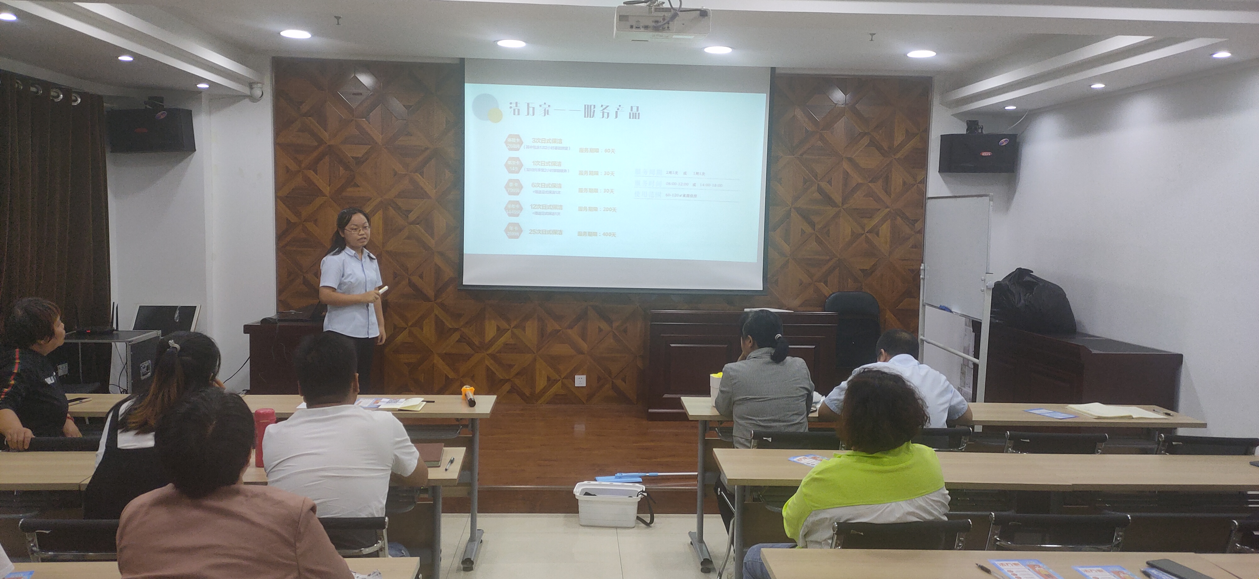 隨后由公司人力資源部負(fù)責(zé)人司夢琴對“潔萬家”日常保潔產(chǎn)品進(jìn)行了分類介紹,此外還介紹了產(chǎn)品推廣獎(jiǎng)勵(lì)方案和推廣話術(shù),對大家日后推廣過程中會遇到的客戶提出的各種問題進(jìn)行了預(yù)設(shè)并一一詳細(xì)作答。