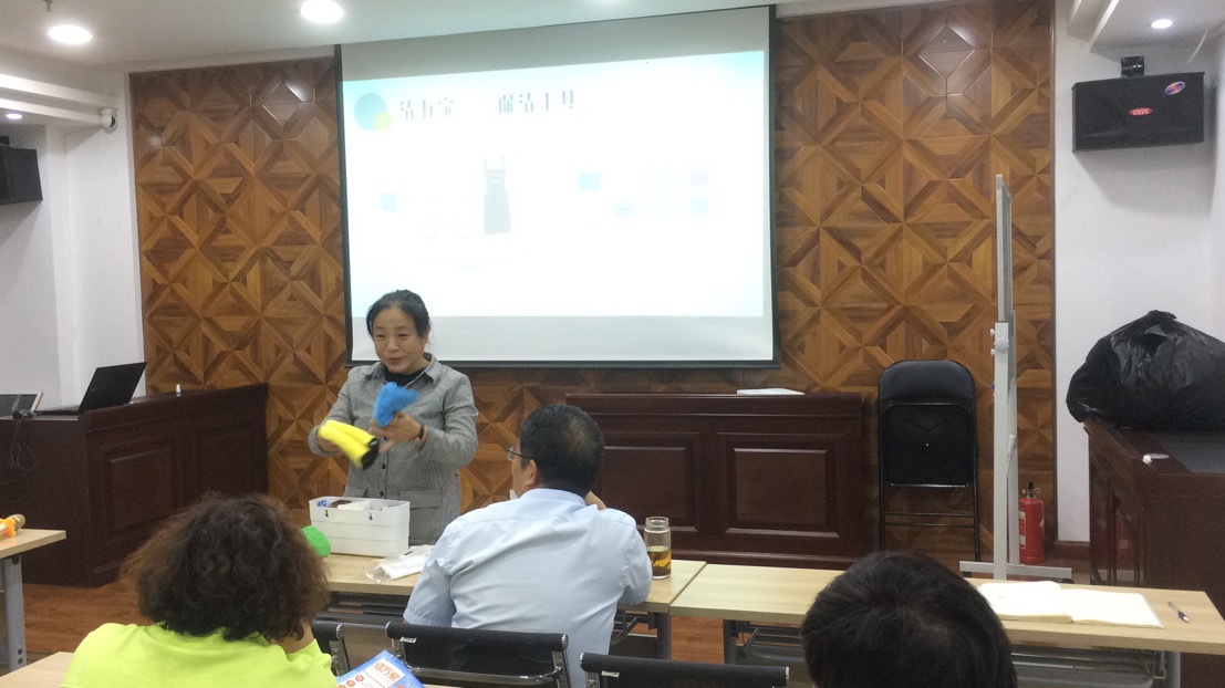 會議開場,從福建福州取經(jīng)回來的人力資源部呂利清用簡短的一句話首先點(diǎn)出了“潔萬家”產(chǎn)品的亮點(diǎn)——“1人1次4小時(shí)日常保潔服務(wù)”,接著她從服務(wù)人員、服務(wù)時(shí)間、服務(wù)內(nèi)容、保潔工具、保潔流程等方面介紹了“潔萬家”日常保潔與年關(guān)保潔以及居家保潔的區(qū)別,并對服務(wù)內(nèi)容所涵蓋的6大區(qū)域(臥室、衛(wèi)生間、餐廳、客廳、廚房、陽臺)以及專用8色保潔布的分類使用進(jìn)行了詳細(xì)的介紹。