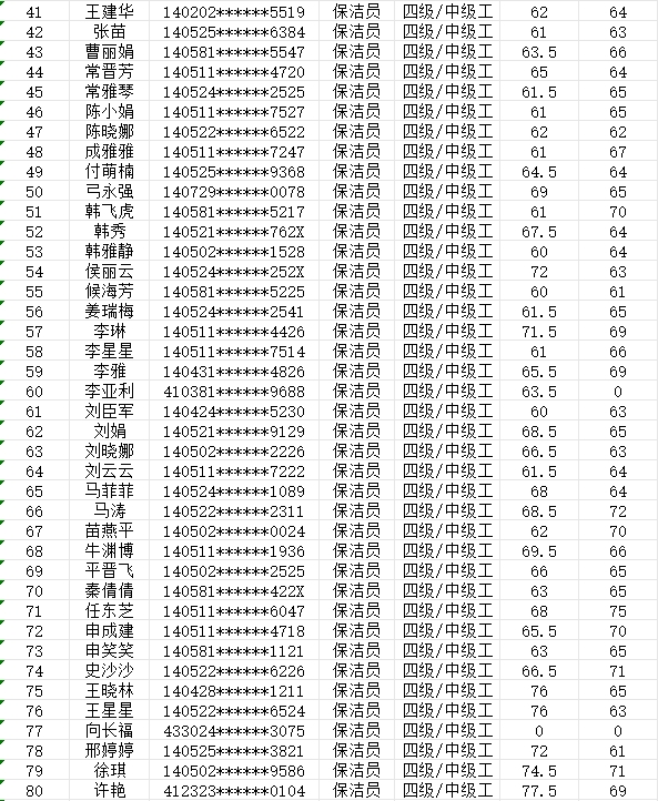 晉城市潔霸清潔服務(wù)股份有限公司職業(yè)技能等級認(rèn)定中心現(xiàn)將2024年2月25日認(rèn)定人員成績公示如下: