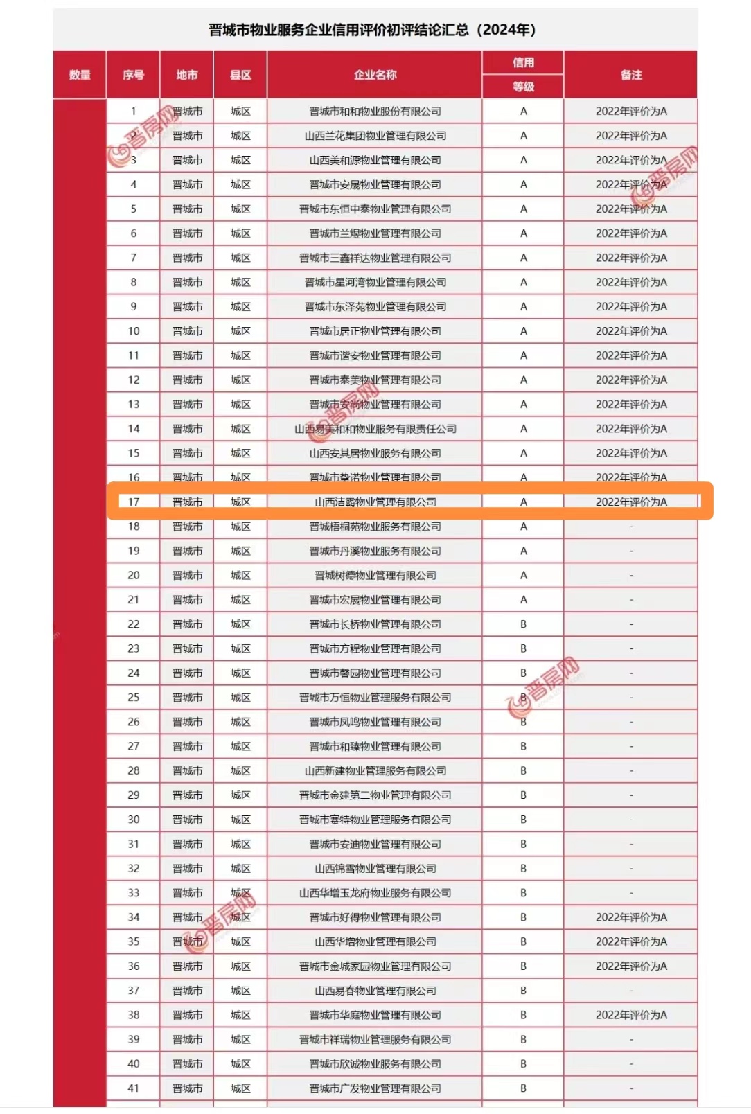 日前,山西省住房和城鄉(xiāng)建設(shè)廳發(fā)布了2023年度房地產(chǎn)企業(yè)信用評(píng)價(jià)結(jié)果的通知,根據(jù)通知顯示,晉城市共有200家物業(yè)服務(wù)公司參加評(píng)定,晉城市潔霸物業(yè)管理有限公司獲得2023年度物業(yè)服務(wù)企業(yè)信用等級(jí)A級(jí)認(rèn)證。在本次考評(píng)結(jié)果中,潔霸物業(yè)光榮上榜,是對(duì)其物業(yè)服務(wù)品質(zhì)的充分肯定。 |