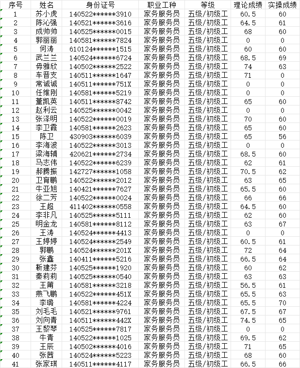 晉城市潔霸清潔服務(wù)股份有限公司職業(yè)技能等級(jí)認(rèn)定中心 2024年5月26日第17批家政服務(wù)員初級(jí)認(rèn)定人員成績公示