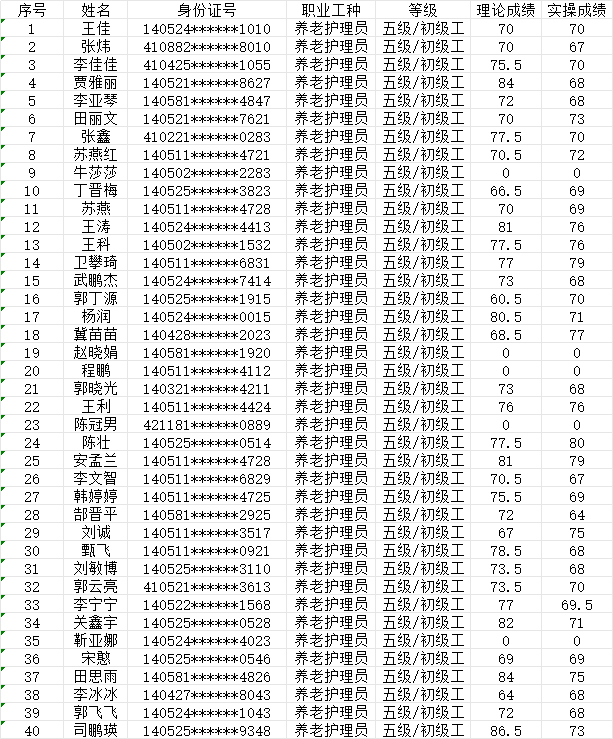 晉城市潔霸清潔服務(wù)股份有限公司職業(yè)技能等級(jí)認(rèn)定中心2024年7月14日第21批養(yǎng)老護(hù)理員初級(jí)認(rèn)定人員成績(jī)公示