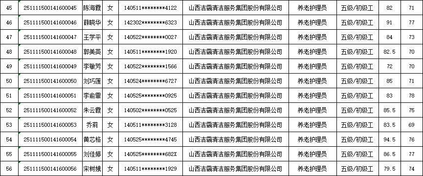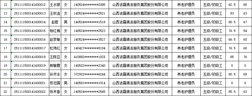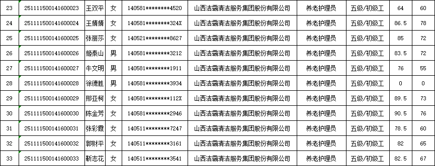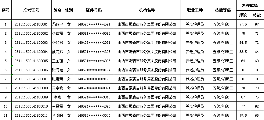 山西潔霸清潔服務(wù)集團(tuán)股份有限公司職業(yè)技能等級認(rèn)定中心2025年11月15日第3批養(yǎng)老護(hù)理員初級認(rèn)定人員成績公示